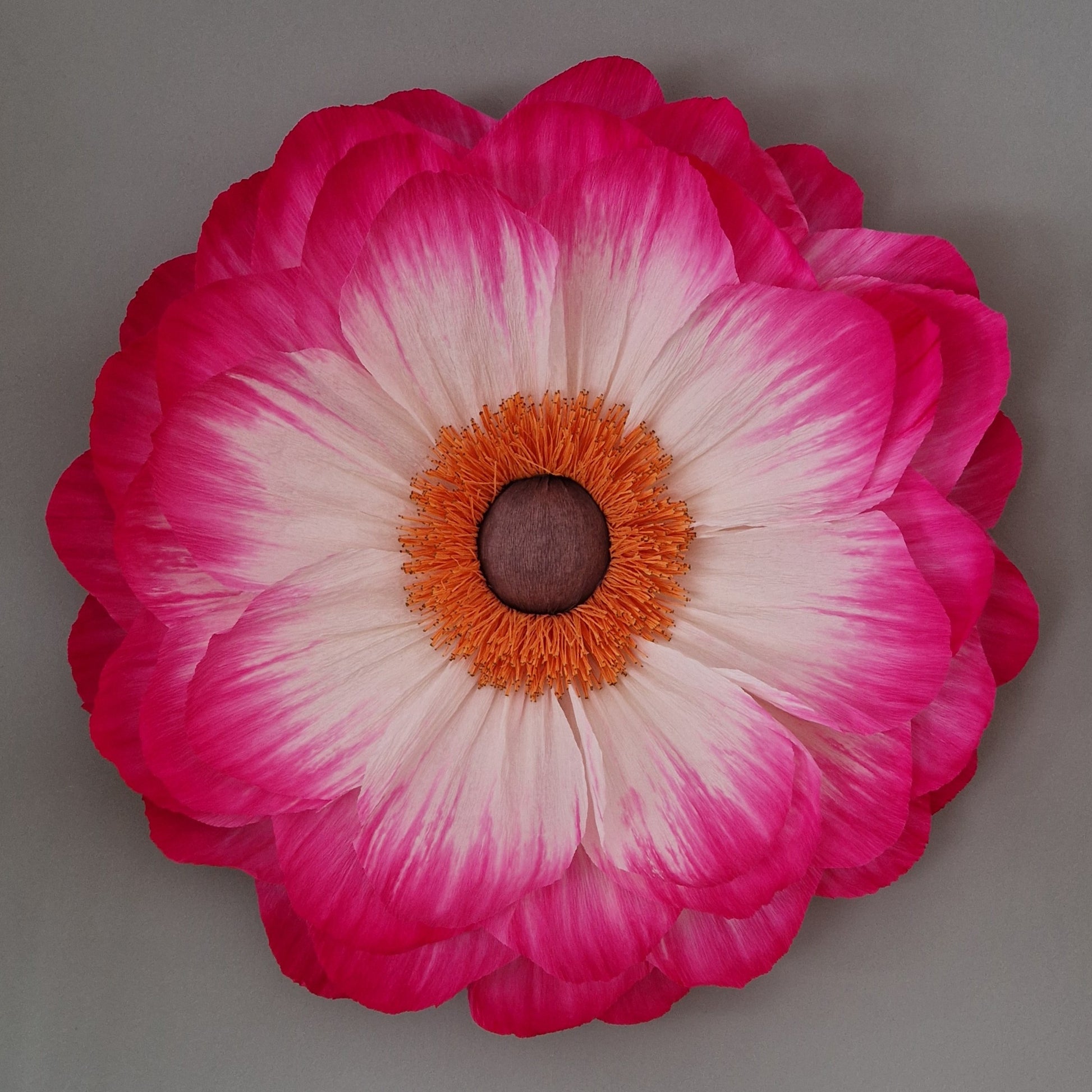 Denne store vægblomst i crepepapir er et håndlavet stykke vægkunst, skabt med omhu og kærlighed til detaljen. Blomsten er håndlavet i det gode italiensk crepepapir og indfarvet i hånden med Ecoline akvarelblæk, hvilket giver et levende og nuanceret farvespil.